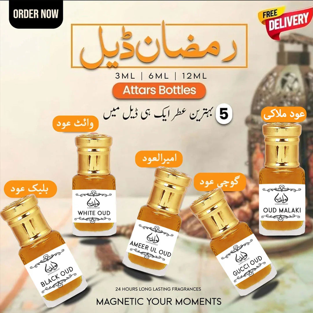 Experience pure luxury with the Premium Attar Deal of 5 by Lawazmaat, featuring five iconic oud fragrances — White Oud, Ameer Ul Oud, Black Oud, Gucci Oud, and Oud Malaki. This exclusive collection is crafted for men who appreciate rich, long-lasting, and deeply masculine scents.